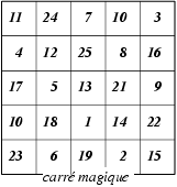 Si vous connaissez un carré magique 5x5 contenant les nombres de 1 à 25 vous pouvez essayer de le transformer en un carré formes & couleurs, [cliquez ici] pour obtenir les éléments correspondants, entre autres possibilités. (Vous n'obtiendrez pas toujours un carré formes & couleurs c.-à-d. gréco-latin).