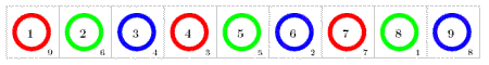Neuf pions numérotés en leur centre de 1 à 9 sont alignés, ils sont de couleur R=rouge, V=verte, B=bleue, R, V, B, R, V, B.